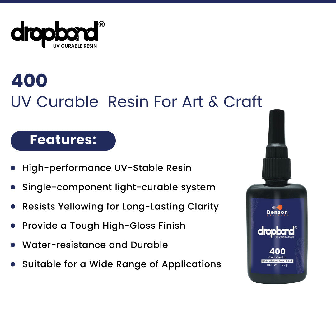 DropBond 400 UV-curable resin is a high-performance, UV-curable, single-component light-curable system specifically designed to cast and pott artifacts in 3D. This versatile product is slightly placed which is why it gives the best results when mixed with resin pigments. It can be used in various applications, including coasters, key rings, artificial jewelry, 3D Fonts through encapsulations, arts and crafts, etc.
