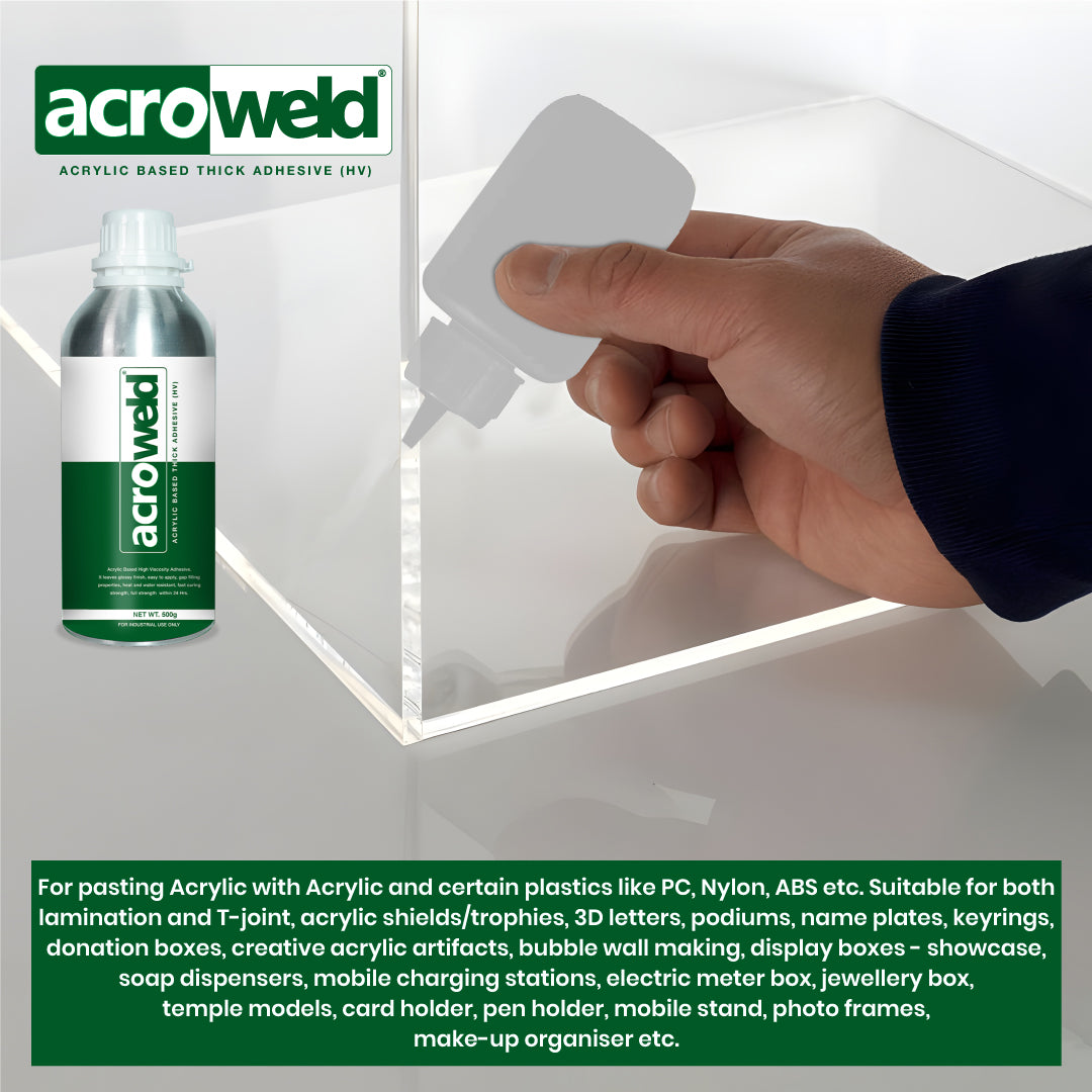 Acroweld (HV) is acrylic based thick adhesive which is primarily used for pasting all kinds of acrylic sheets and some plastics like ABS, PC, nylon etc. and have super gap filling properties. This is a transparent adhesive which dries clear and leaves a glossy finish. In some applications it can also be used as a surface coating solution like wood, stones etc.