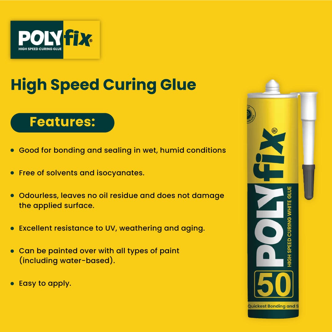 POLYFIX 50 High-Speed Curing White Glue by Polyfix is a versatile construction and sealing adhesive that stands out for its impressive qualities. This odourless and solvent-free glue is ideal for bonding and sealing in wet and humid conditions. It leaves no oil residue and does not harm the applied surface. With excellent resistance to UV, weathering, and aging, it can even be painted over with various paint types, including water-based options.