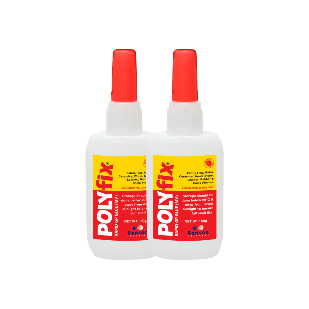 Polyfix Rapid GP Glue (MV): Turant Chipkao, Mazboot Chipkao - The No. 1 Instant Glue for Strong Bonds. This strong and fast-drying glue dries in just 1-4 minutes and holds tight. You can use it in different industries for lots of jobs, but it's especially good for things like rubber O-rings, air and oil filters, and fixing logos. This glue is a bit thicker, so it won't drip or spread when you use it. It's great for jobs where you need to fill tiny gaps, and it dries quickly. It works on surfaces that can soak up the glue and on surfaces that can't. You'll find it in easy-to-hold squeeze bottles. To use it, just put the glue on one surface, then line up and press the second surface onto it. Hold it in place with your hand for a few minutes, and it will stick well.