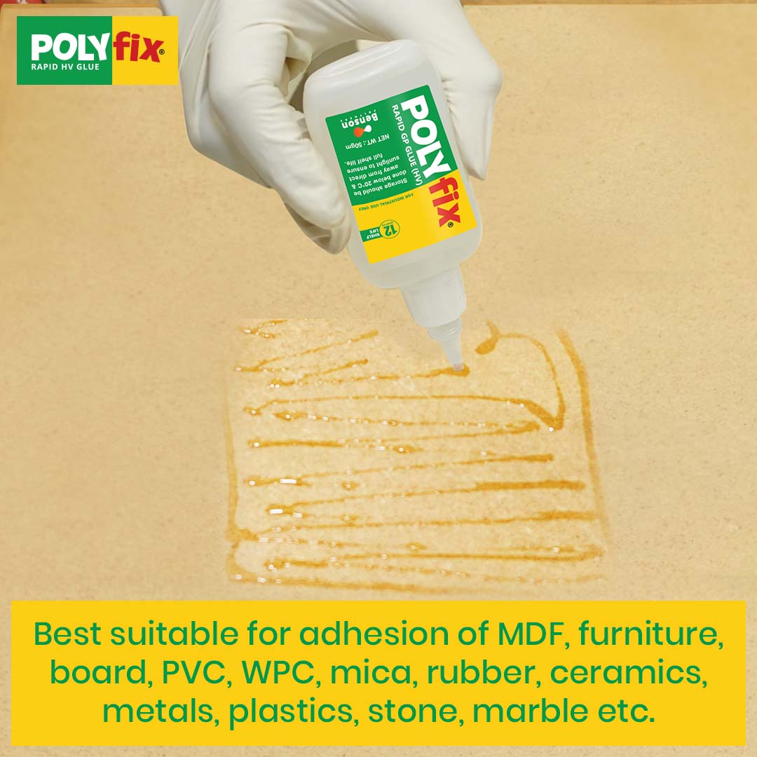Polyfix Rapid GP Glue (HV): Turant Chipkao, Mazboot Chipkao - The No. 1 Instant Glue for Strong and Fast Bonds. This strong and long-lasting glue dries quickly, usually in about 10-15 minutes. It sticks well to different surfaces in various industries, but it's mainly used for indoor jobs. You can use it to stick things like PVC, charcoal, acrylic, and Mica sheets onto PVC/WPC foam boards, MDF, HDHMR, Gypsum, Particle, and PLYWOOD boards. You don't need to use masking tapes when you use this glue.