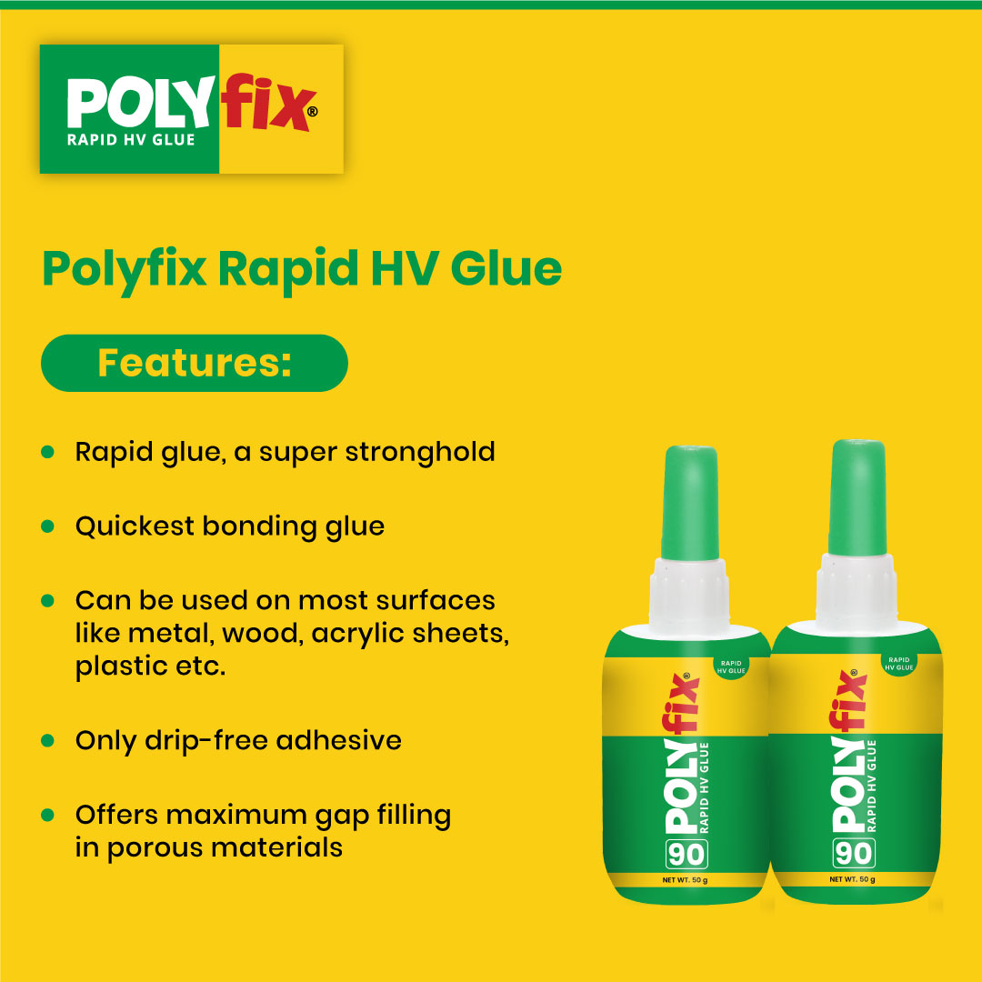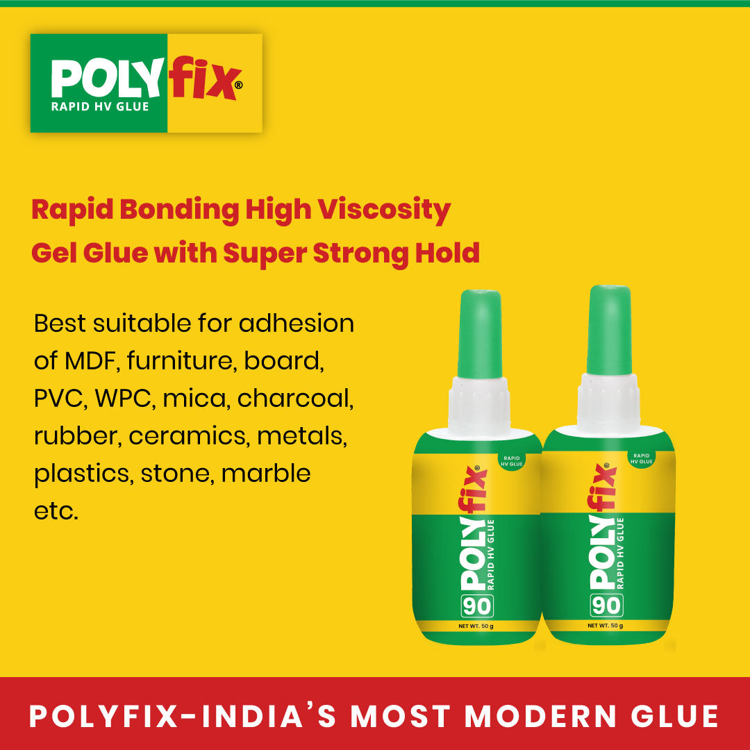 Polyfix Rapid GP Glue (HV): Turant Chipkao, Mazboot Chipkao - The No. 1 Instant Glue for Strong and Fast Bonds. This strong and long-lasting glue dries quickly, usually in about 10-15 minutes. It sticks well to different surfaces in various industries, but it's mainly used for indoor jobs. You can use it to stick things like PVC, charcoal, acrylic, and Mica sheets onto PVC/WPC foam boards, MDF, HDHMR, Gypsum, Particle, and PLYWOOD boards. You don't need to use masking tapes when you use this glue. It's also good for jobs where there are small gaps between surfaces, like sticking metal strips onto wooden, WPC, or PVC boards. You can use it with Polyfix spray activator, but it's a good idea to get advice from the company or watch a video on YouTube to make sure you use it correctly. The glue is thick and won't drip or run, so it's great for jobs where you need to stick things vertically. It works well on surfaces that can absorb the glue and on surfaces that can't. You'll find it in easy-to-hold squeeze bottles. To use it, just put the glue on one surface, then line up and press the second surface onto it. Hold it in place with your hand for a few minutes, and it will stick well.